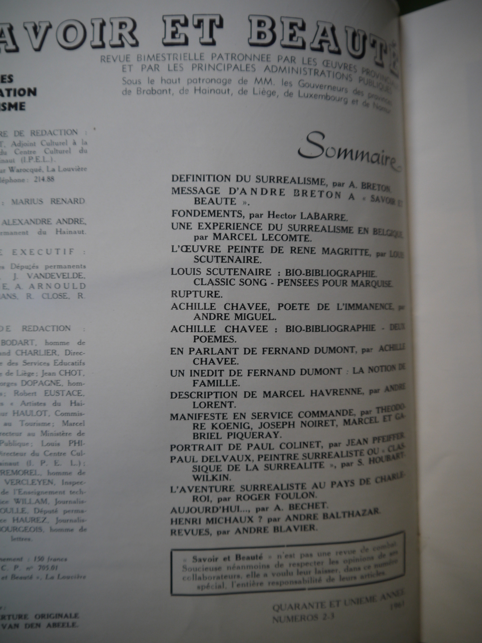 Le numéro double 2-3 (41e année) d’une revue patronnée par « les oeuvres provinciales et les principales administrations publiques ». Parmi les contributeurs, citons Marcel Lecomte, Louis Scutenaire, Fernand Dumont…