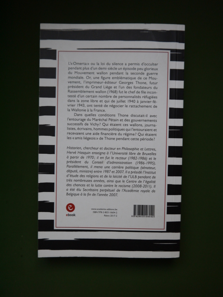 L’édition de poche. Récit des contacts entre des intellectuels wallons (avec à leur tête l’éditeur liégeois Georges Thone) et certains personnages de Vichy en vue d’un rattachement de la Wallonie à la France…