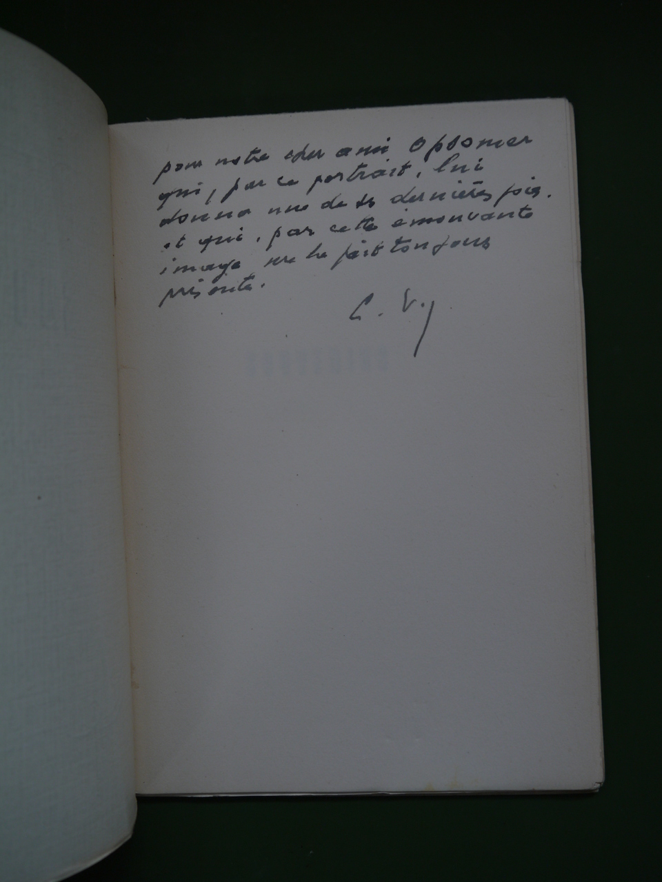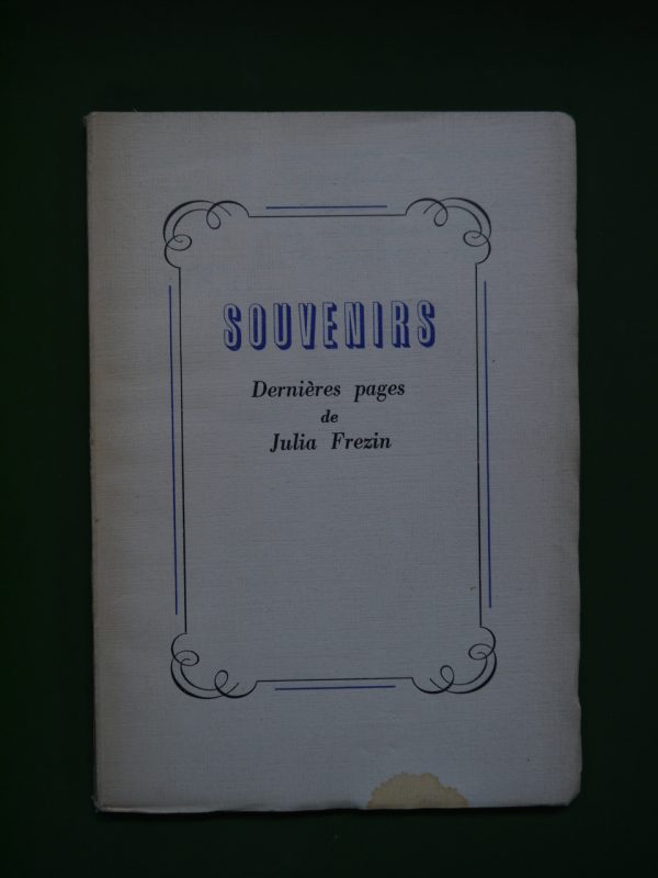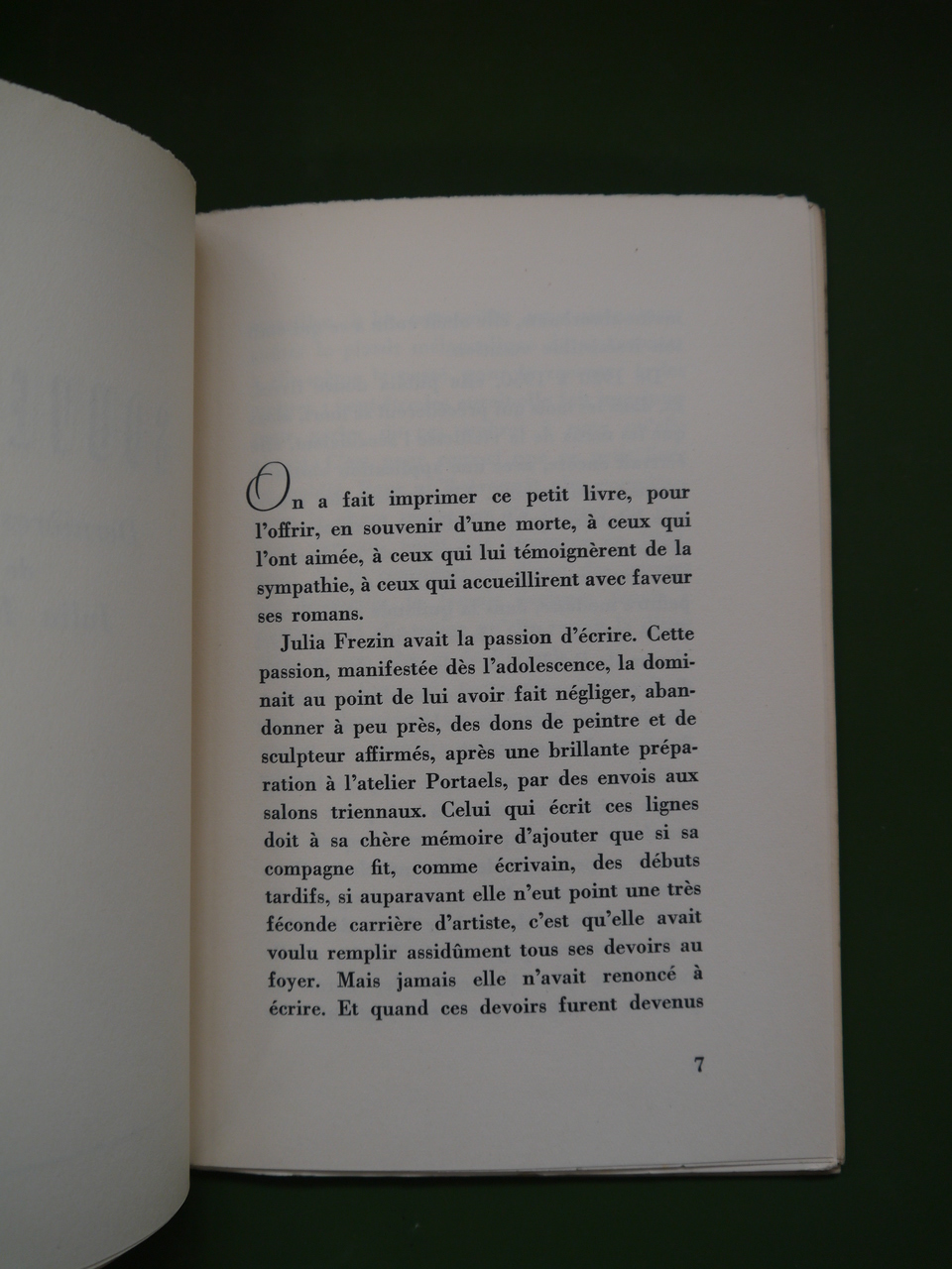 Les derniers paragraphes posthumes de Julia Frezin, édités par son mari, avec un envoi au peintre Opsomer qui avait peint l’écrivaine.