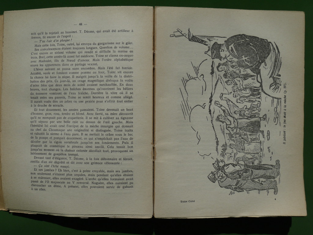 « Il est de fait que Toine a la position cadavérique: il gît! A part ça, Man Justine exagère, car le tué hurle et, du pied, sonne la générale dans le seau renversé. »
