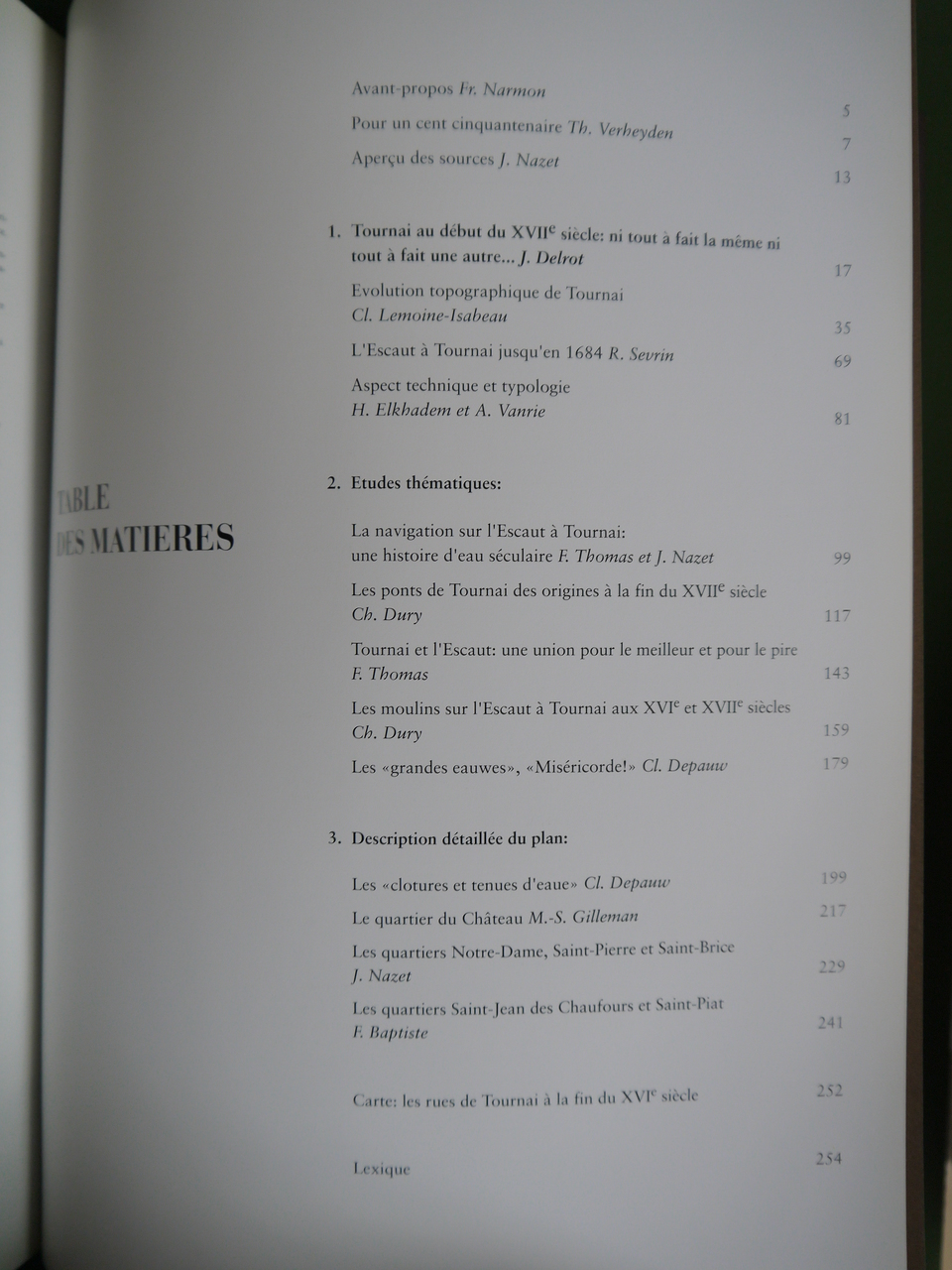 Ce volume s’efforce de restituer l’aspect de Tournai antérieur aux travaux d’aménagement de l’Escaut de 1684 à travers l’édition commentée d’un plan du fleuve réalisé en 1622. Ce plan fut dessiné à l’occasion de conflits qui, du milieu du XVIe à la fin du XVIIe siècle, opposèrent en matière de navigation la Cité royale à d’autres villes de l’Escaut et de certains de ses affluents (Douai, Valenciennes, Mons, Audenarde, Gand et Anvers).