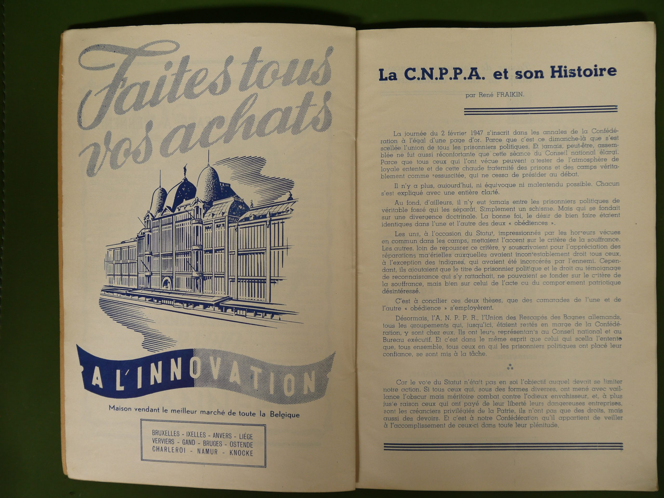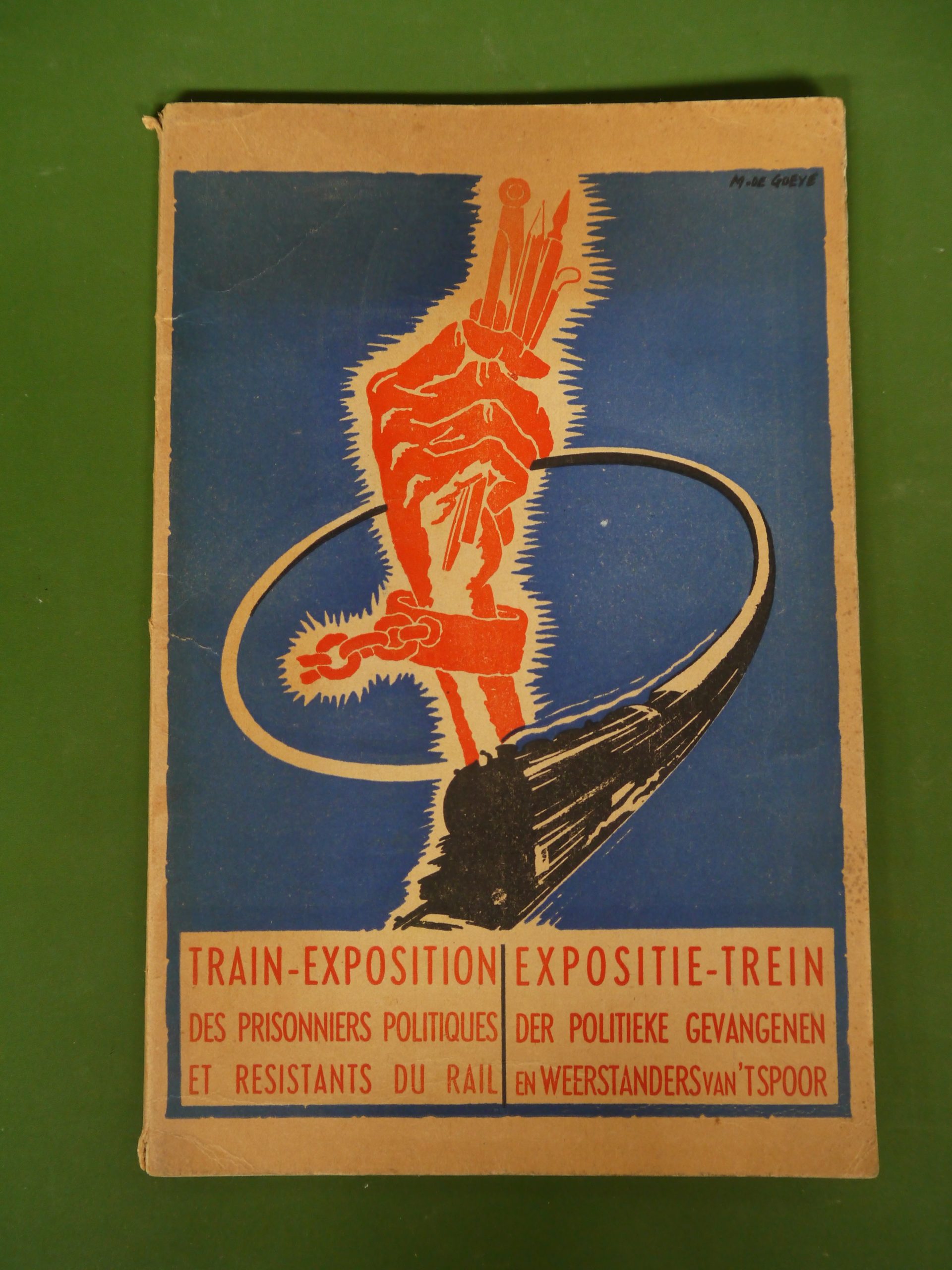 Le titre en néerlandais: » Expositie-trein der politieke gevangenen en weerstanders van’t spoor ». Brochure bilingue présentant l’exposition itinérante présentée par la Confédération nationale des prisonniers politiques et ayants-droit. Contient en bonus de nombreuses publicités d’époque.