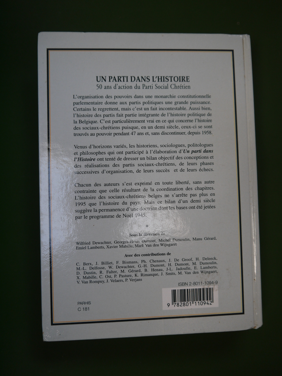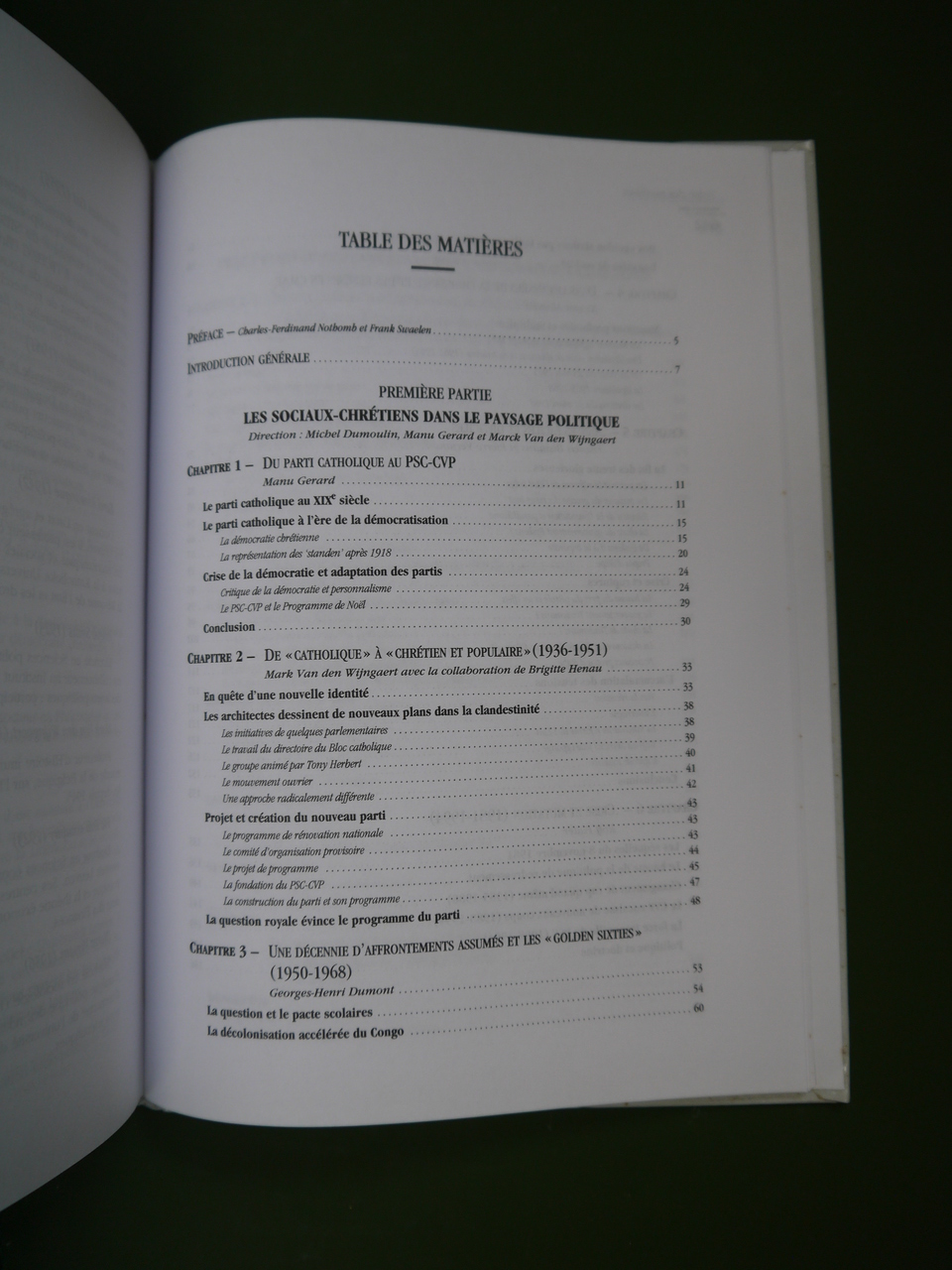 « 50 ans d’action du Parti Social chrétien », le PSC de Charles-Ferdinand Nothomb, son président de l’époque. L’exemplaire proposé est légèrement défraîchi.