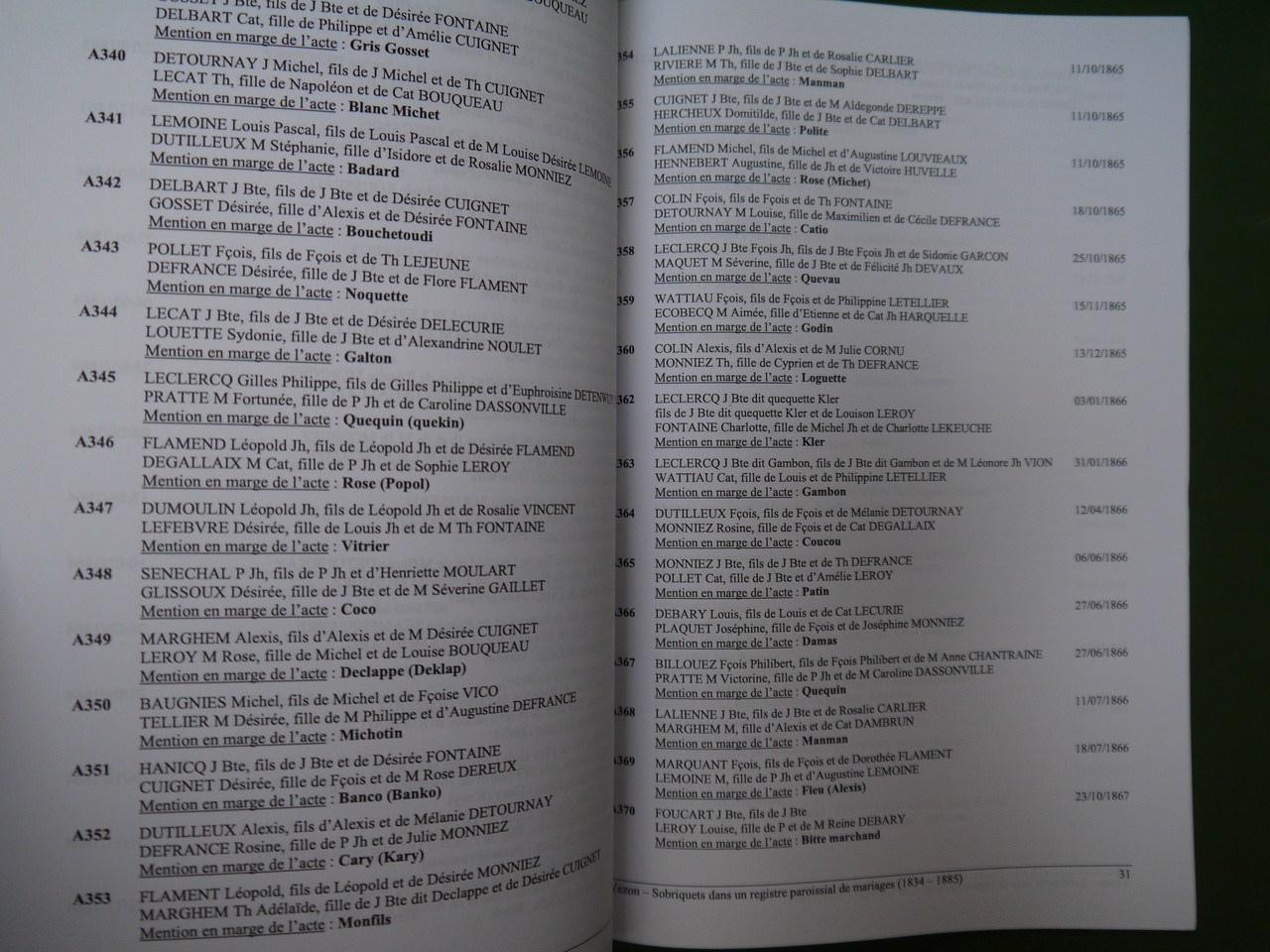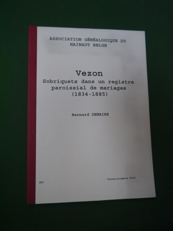 Soyez le premier à laisser votre avis sur “Vezon, sobriquets dans un registre paroissial de mariages (1834-1885), Bernard Demaire, Association généalogique du Hainaut belge, 2010”