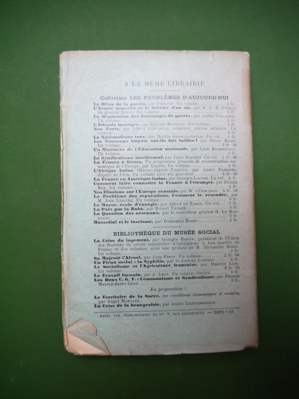 Dans la collection « Les problèmes d’aujourd’hui »… il y a cent ans déjà!